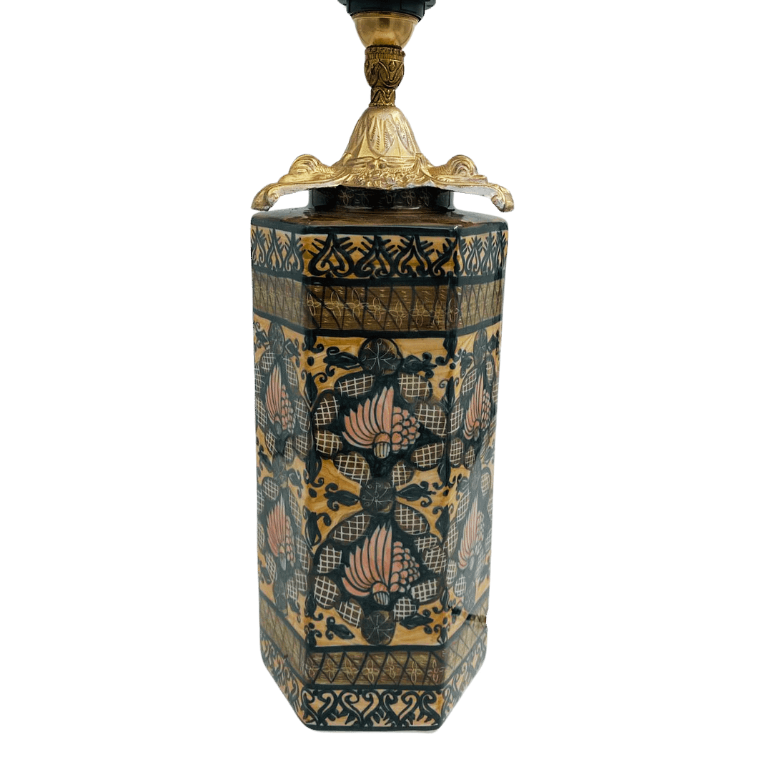 Een zeshoekige keramieken vaas met een decoratief messing afdekplaat.